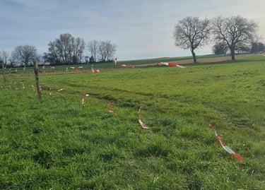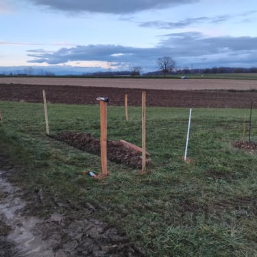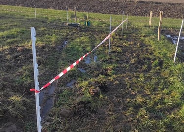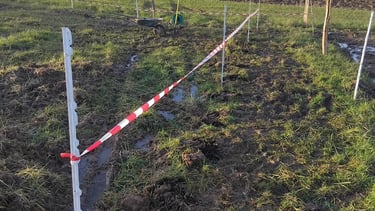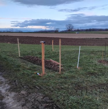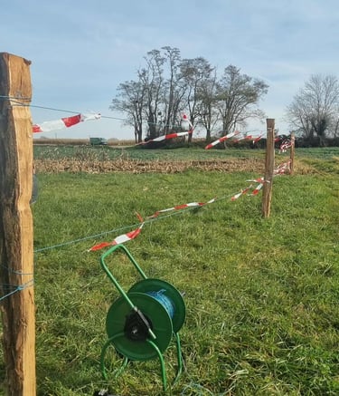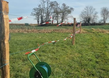 Encore un imprévu la semaine dernière .... nous avons dû un peu à la hâte poser des piquets et matérialiser une clôture avec du fil de clôture et de la rubalise. Pourquoi ?