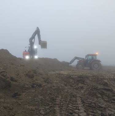 Aujourd'hui on a refait le chemin d’accès au chantier, et on a commencé a remplir la plate-forme qui accueillera le hangar et la zone de manœuvre (et qui, servira aussi de parking client)