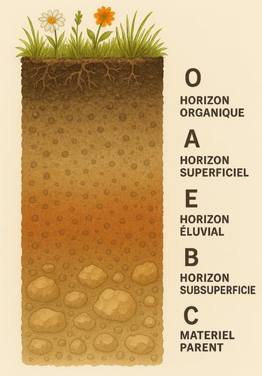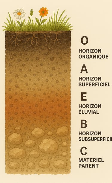Les horizons du sol sont les couches superposées qui composent un sol, chacune ayant une couleur, une structure, une composition et une histoire différentes. Elles se forment très lentement, sous l’effet du climat, des organismes vivants, de l’eau et de l’altération de la roche mère.